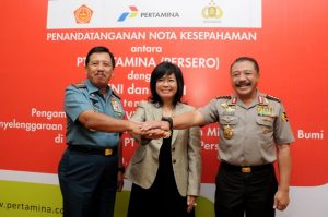 Penandatanganan MoU itu dilakukan oleh Direktur Utama Pertamina Karen Agustiawan, Panglima TNI Laksamana Agus Suhartono, dan Kepala Polri Timur Pradopo di Jakarta. MoU berisi kesepakatan kerjasama antara Pertamina dan TNI serta Polri, dalam mengamankan objek vital nasional strategis, khususnya aset-aset operasional, produksi dan distribusi produk energi yang dikelola oleh Pertamina.