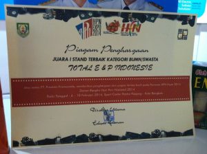 Piagam penghargaan stand terbaik HPN Expo 2014 yang diperoleh Total E&P Indonesia dalam Peringatan Hari Pers Nasional di Bengkulu.
