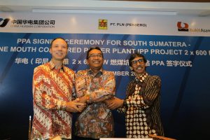 Dari kiri ke kanan: Direktur Utama China Huadian Corporation, Cheng Nangao bersama Direktur Utama PLN, Nur Pamudji dan Direktur Utama PTBA Milawarma, usai penandatanganan PPA PLTU Mulut Tambang Sumsel-8.