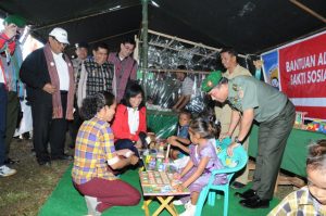 Direktur Utama Pertamina, Karen Agustiawan (berjas merah) dan Kepala Staf TNI AD Jenderal TNI Moeldoko (kanan) bercengkerama dengan para siswa PAUD dalam Bakti Sosial di Desa Loluna Puebulak, Kabupaten Belu, NTT, yang berbatasan dengan wilayah Timor Leste.
