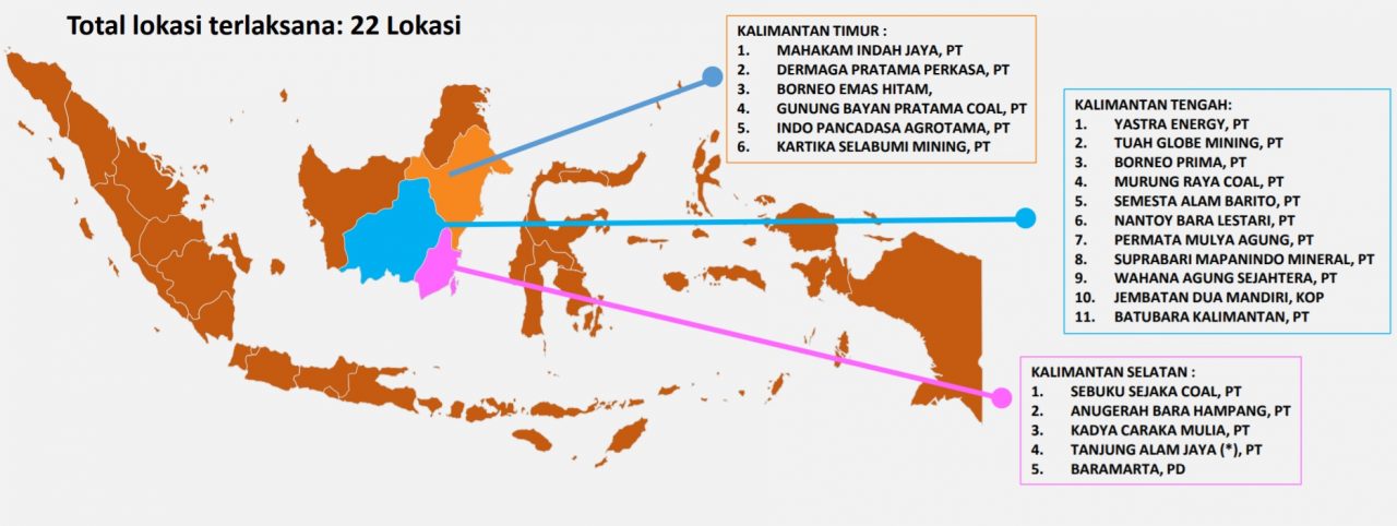 Sementara untuk Kalimantan Tengah rinciannya, PT YASTRA ENERGY, PT TUAH GLOBE MINING, PT BORNEO PRIMA, PT MURUNG RAYA COAL, PT SEMESTA ALAM BARITO, PT NANTOY BARA LESTARI, PT PERMATA MULYA AGUNG, PT SUPRABARI MAPANINDO MINERAL, PT WAHANA AGUNG SEJAHTERA, KOP JEMBATAN DUA MANDIRI, PT BATUBARA KALIMANTAN. Sedangkan untuk yang di Kalimantan Selatan rinciannya, PT SEBUKU SEJAKA COAL, PT ANUGERAH BARA HAMPANG, PT KADYA CARAKA MULIA, PT TANJUNG ALAM JAYA (*), PD BARAMARTA.