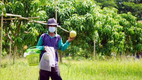 Salah seorang petani mitra binaan KPI RU VI Balongan memperlihatkan mangga hasil budidayanya di Indramayu, Jawa Barat.