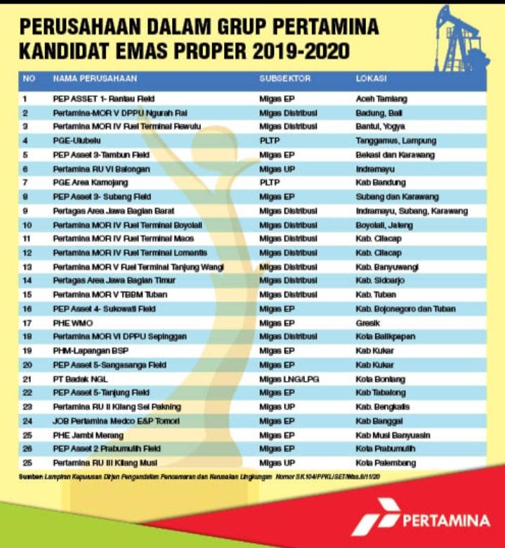 Paling mutakhir adalah masuknya perusahaan dalam Grup Pertamina sebagai kandidat peraih Emas PROPER dari Kementerian Lingkungan Hidup dan Kehutanan periode 2019-2020. Berdasarkan lampiran Keputusan Direktur Jenderal Pengendalian Pencemaran dan Kerusakan Lingkungan Kementerian Lingkungan Hidup dan Kehutanan Nomor SK 104/PPKL/SET/Was,8/11/20 tentang Penetapan Kandidat Emas Program Penilaian Peringkat Perusahaan dalam Pengelolaan Lingkungan Hidup Tahun 2019-2020, perusahaan dalam Grup Pertamina menempatkan 25 perusahaan atau 52% dari total 48 perusahaan yang masuk sebagai kandidat peraih Emas PROPER 2020.