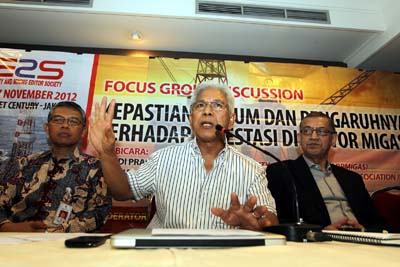 Pakar migas Dr Abdul Muin (tengah) bersama Kadiv Humas, Sekuriti dan Formalitas BPMIGAS, Hadi Prasetyo (kiri) dan Direktur Eksekutif Indonesian Petroleum Association (IPA) Dipnala Tamzil, saat menjadi pembicara dalam FGD Kepastian Hukum di Sektor Migas, Rabu, 7 November 2012.