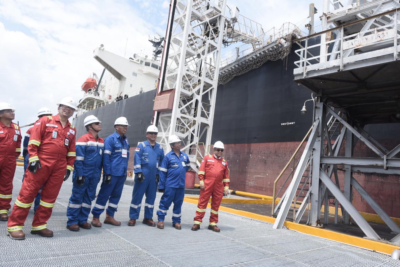 Peresmian secara simbolis penekanan tombol lifting di Pelabuhan Wharf 1 Area Operasi Rokan PT CPI, Selasa (15/1). (foto: ist)