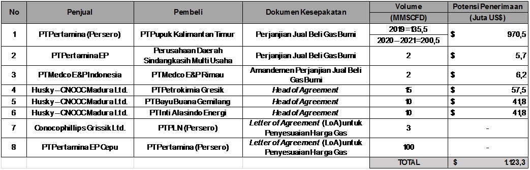 Adapun kesepakatan jual beli gas yang ditandatangani antara lain perjanjian jual beli gas bumi (PJBG) antara PT Pertamina (Persero) dengan PT Pupuk Kalimantan Timur (PKT) dengan volume sampai 200 juta kaki kubik per hari (MMscfd), selama tiga tahun dengan potensi penerimaan US$970 juta dan Letter of Agreement (LoA) untuk Penyesuaian Harga Gas antara PT. Pertamina EP Cepu dan Pertamina dengan volume sebesar 100 MMscfd.