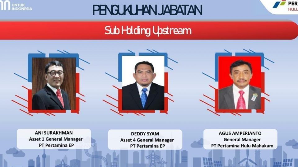 JAKARTA- Budiman Parhusip, Direktur Utama PT Pertamina Hulu Energi, upstream subholding PT Pertamina (Persero), mengukuhkan tiga general manager (GM) baru di lingkungan perusahaan, Jumat (2/10). Ketiga GM yang dikukuhan secara daring tersebut adalah Ani Surakhman sebagai Asset 1 GM PT Pertamina EP (PEP), Deddy Syam jadi Asset 5 GM PT Pertamina EP, dan Agus Amperianto menjabat GM PT Pertamina Hulu Mahakam.