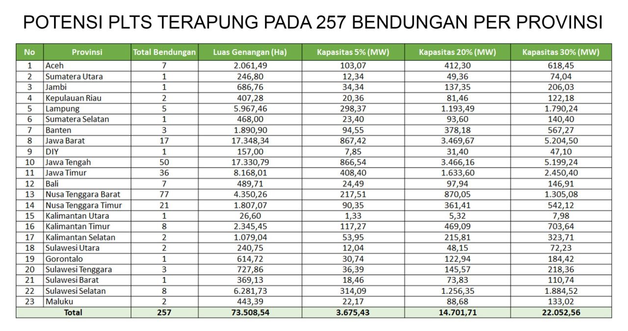 Untuk PLTS Terapung ini merupakan “senjata” andalan yang bisa digunakan jika mau mengejar target NZE karena diproyeksikan memiliki kapasitas mencapai 89,37 GW di 293 lokasi terdiri dari potensi pembangunan di bendungan yang dikelola oleh Kementerian Pekerjaan Umum dan Perumahan Rakyat (PUPR) adalah sebanyak 257 lokasi (bendungan) dengan kapasitas mencapai 14,7 GW serta pembangunan di 36 lokasi danau dengan total kapasitas bisa mencapai 74,67 GW. Besarnya potensi PLTS Terapung ini juga didukung oleh adanya perubahan Permen PUPR No. 7 Tahun 2023 tentang Bendungan. Beleid tersebut memberikan peluang pemanfaatan ruang pada daerah genangan waduk hingga 20% (atau lebih) yang semula hanya 5% dari luas genangan pada muka air normal.