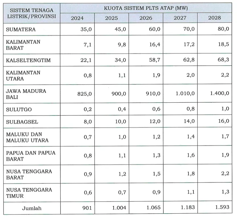 Untuk tahun ini kuota sistem PLTS Atap ditetapkan sebesar 901 Megawatt (MW). Jumlah kuota terus meningkat setiap tahun dimana untuk tahun 2025 kuotanya ditetapkan 1.004 MW. Lalu tahun 2026 sebesar 1.065 MW. Meningkat menjadi 1.183 MW tahun 2027 serta menjadi 1.593 MW di tahun 2028.