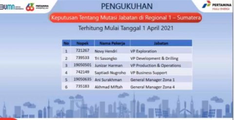 Sumber Dunia Energi yang mengetahui pelantikan para pejabat level GM/VP tersebut membisikkan, pengukuhan atas keputusan tentang mutasi jabatan tersebut terhitung mulai tanggal 1 April 2021.