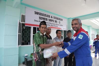 Pertamina EP pada kegiatan syukuran tajak sumur Sopa DZ-2 menyerahkan santunan kepada anak yatim dan juga memberikan bantuan sembako kepada masyarakat sekitar. (RA)