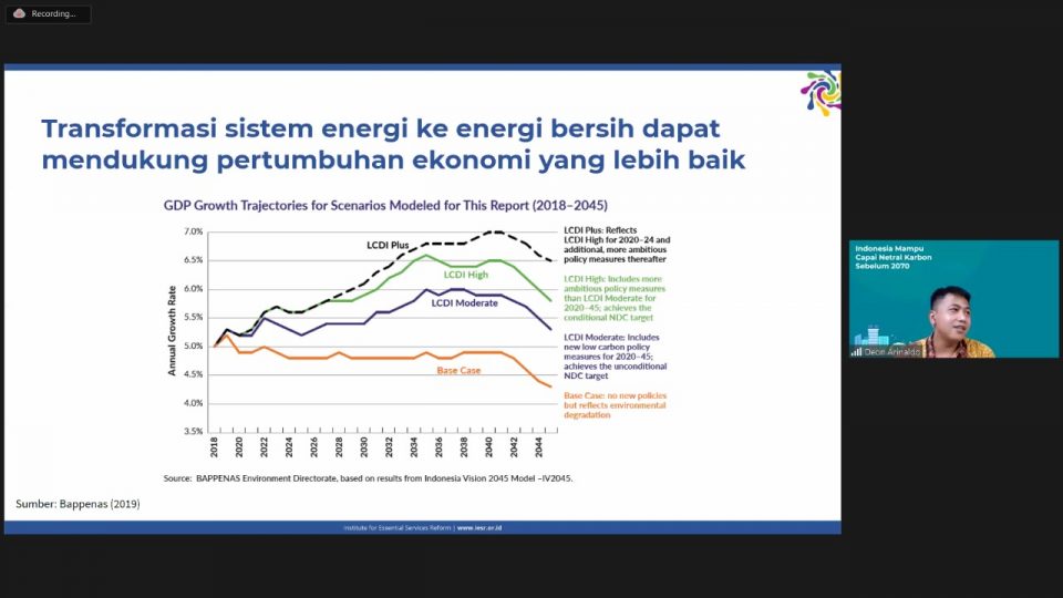 Deon Arinaldo, Manager Program Transformasi Energi IESR, mengatakan Indonesia mampu meningkatkan bauran energi primer dari energi terbarukan menjadi 69% pada 2050 dengan meningkatkan kapasitas pembangkit energi terbarukan menjadi minimal 24 Giga Watt (GW) pada 2025, membangun 408-450 GW pembangkit energi terbarukan pada tahun 2050, dan menghentikan pembangunan PLTU batu bara baru sejak 2025 serta mempensiunkan PLTGU lebih awal.
