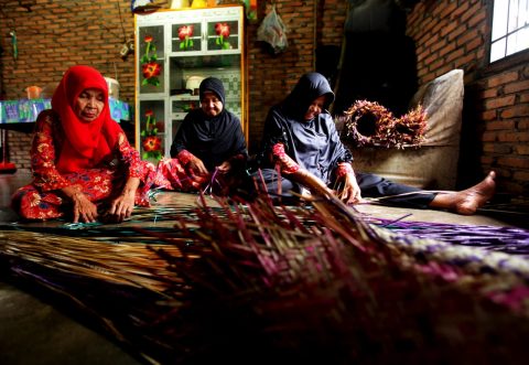Ibu-ibu anggota Kelompok Serasi tengah menganyam purun jadi kerajinan, antara lain tikar. (Foto/Dunia Energi/ A. Tatan Rustandi).