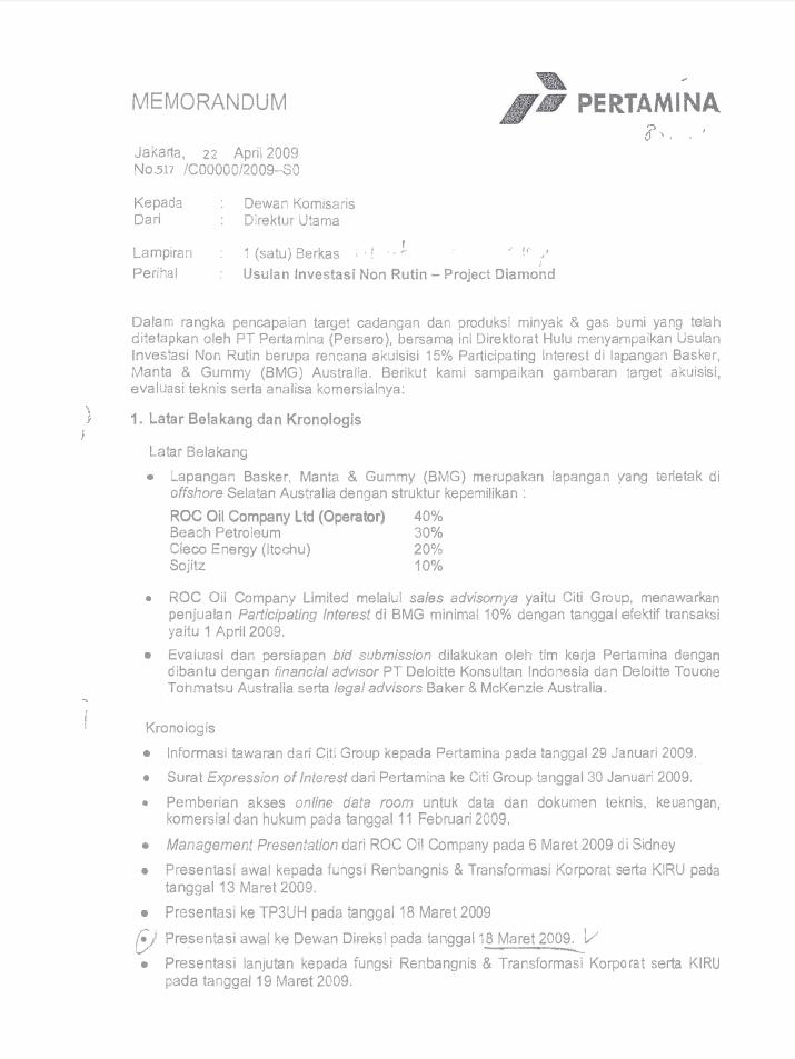 Berdasarkan usulan tersebut, Direksi memohon persetujuan Dewan Komisaris agar Pertamina melaksanakan investasi non rutin berupa akuisisi PI ROC pada Blok BMG. Sesuai ketentuan Anggaran Dasar Pertamina, Direksi membutuhkan persetujuan Dewan Komisaris untuk melakukan akuisisi. Terhadap usulan tersebut, Dewan Komisaris menyatakan persetujuannya agar Pertamina mengikuti bidding project diamond sesuai Memo Dekom tanggal 30 April 2009 (akuisisi PIC ROC pada blok BMG).