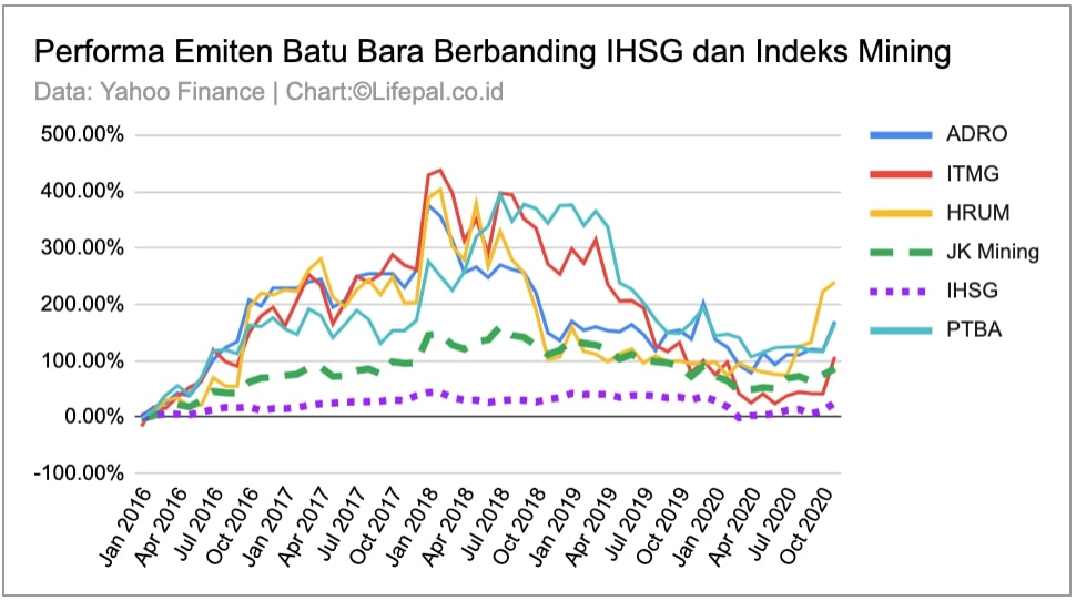 Jumat (4/11), kerja sama CCTDA dan APBI-ICMA diproyeksi akan berdampak positif bagi emiten-emiten yang bergerak di bidang batu bara. Lifepal mengidentifikasi keempat emiten perusahaan batu bara tersebut memiliki porsi penjualan batu bara ke China yang cukup besar. Pada periode akhir 2015 hingga November 2020, keempat emiten pertambangan tersebut kinerjanya sanggup mengalahkan Indeks Harga Saham Gabungan (IHSG) dan Indeks Mining, indeks emiten-emiten pertambangan tempat mereka bernaung.