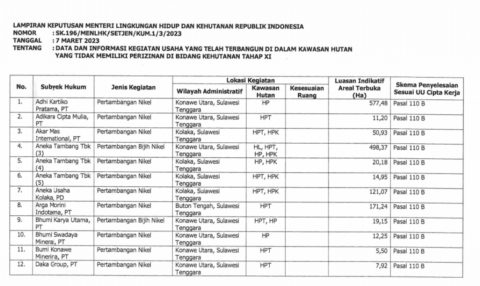 JAKARTA – Menteri Lingkungan Hidup dan Kehutanan (LHK) mengeluarkan keputusan Nomor SK.196/MENLHK/SETJEN/KUM.1/3/2023 tentang data dan informasi kegiatan usaha yang telah terbangun di dalam kawasan hutan yang tidak memiliki perizinan di bidang kehutanan tahap XI, pada Maret 2023.