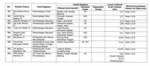 Sebanyak 890 perusahaan pun menjadi sasaran Kementerian LHK terkait operasional usaha tanpa izin di kawasan hutan tersebut. Dari ke-36 perusahaan terdapat PT Semen Indonesia (SI), Solusi Bangun Indonesia (SBI) dan PT Aneka Tambang Tbk (Antam) yang merupakan Badan Usaha Milik Negara (BUMN) dan perusahaan swasta lainnya.