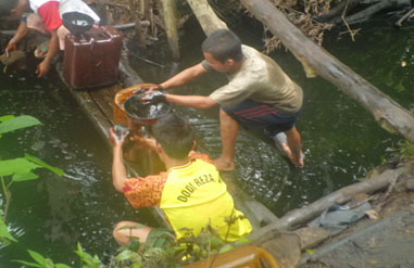 Warga menimba minyak dari kolam penampungan illegal tapping. kalau terpergok, mereka beralasan sedang menambang minyak dari sumur tua.