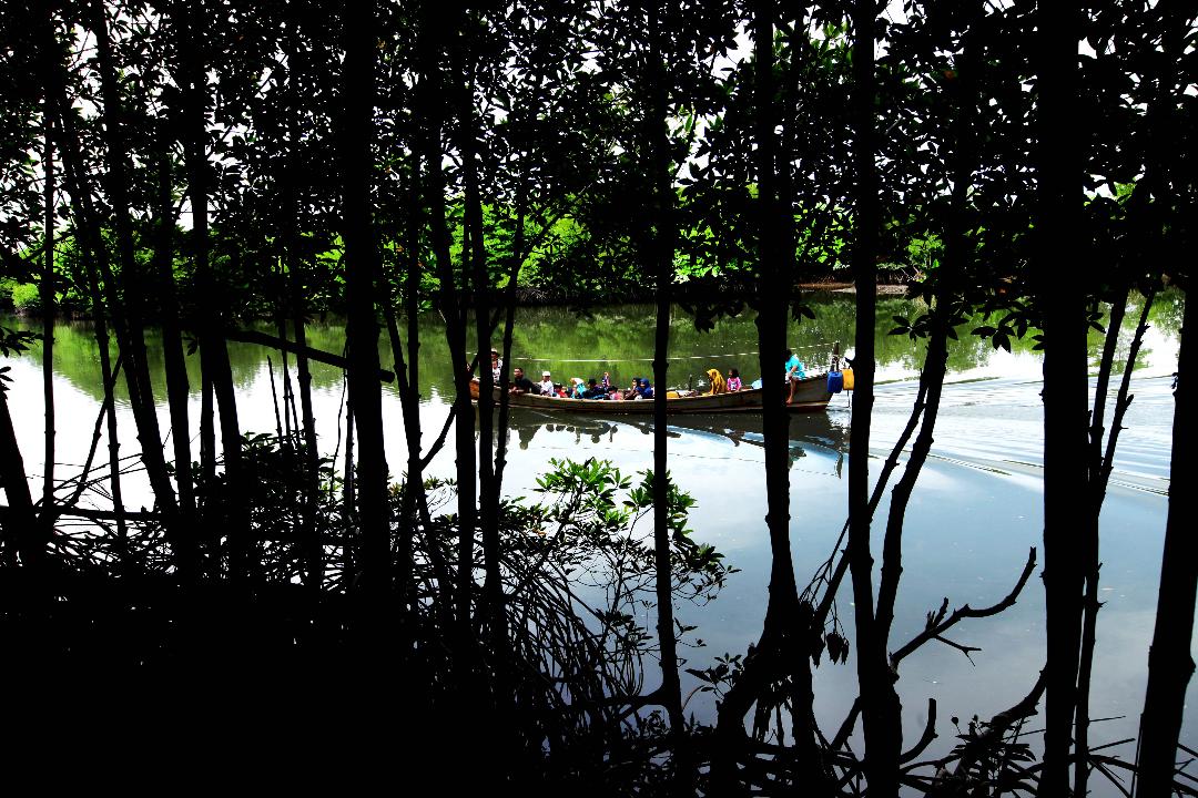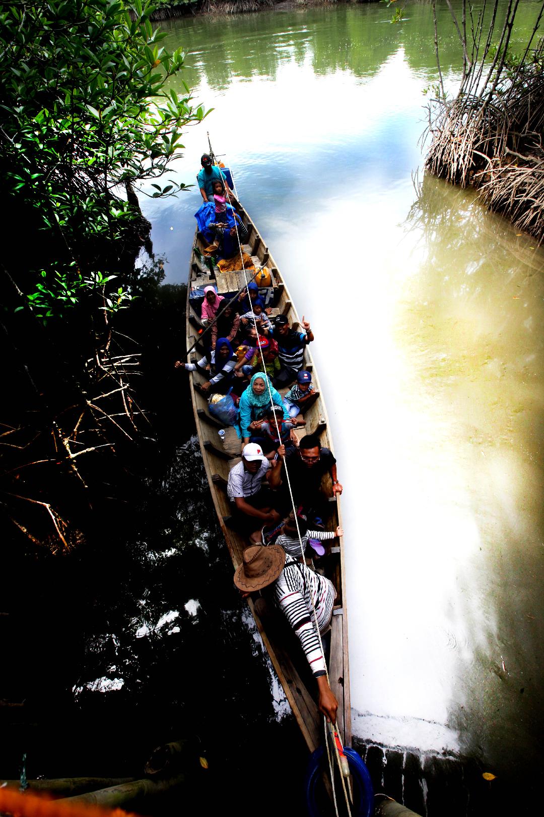 Pengunjung hutan mangrove Lubuk Kertang naik perahu. (foto: A Tatan Rustandi/Dunia-Energi)