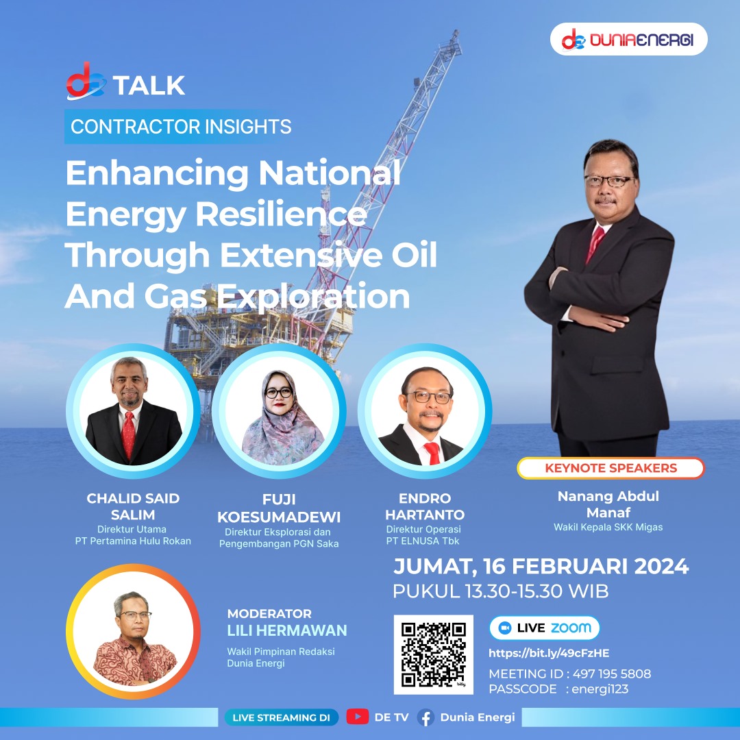 Selain potensi diyakini masih besar tantangannya tentu juga tidak sedikit dalam kegiatan eksplorasi. untuk itu Dunia Energi menggelar Webinar bertajuk “Contractor Insights : Enhancing National Energy Resiliance Through Extensive Oil and Gas Exploration” yang akan diisi oleh beberapa narasumber. Sebagai keynote speaker adalah Nanang Abdul Manaf, Wakil Kepala SKK Migas.
