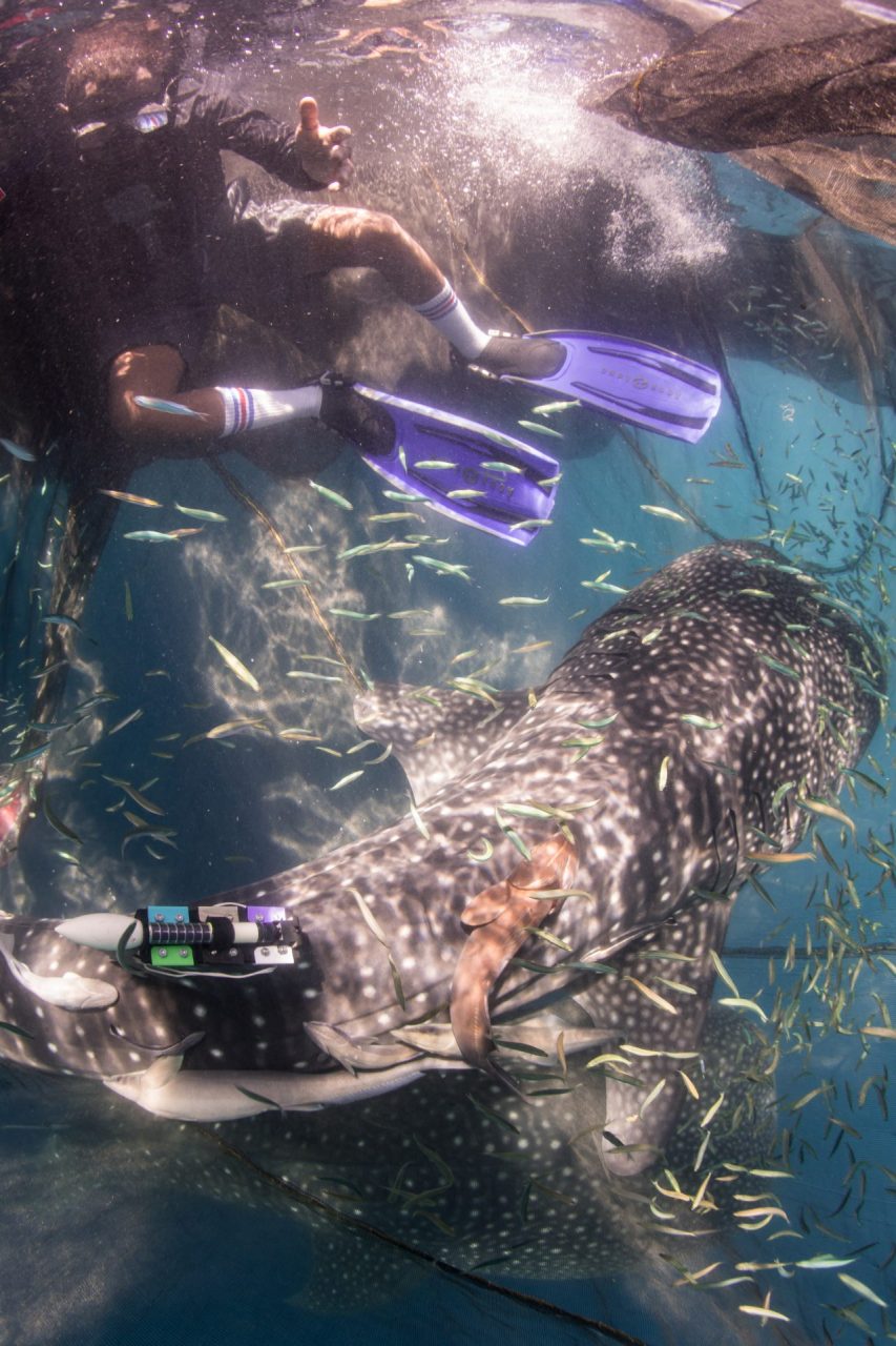 Setelah beberapa waktu berjibaku dengan Hiu Paus, Marcus, petugas TNTC akhirnya sukses memasang alat monitoring ke sirip Hiu Paus. Harapannya alat tersebut tidak cepat lepas sehingga mampu mengirimkan data yang akurat.