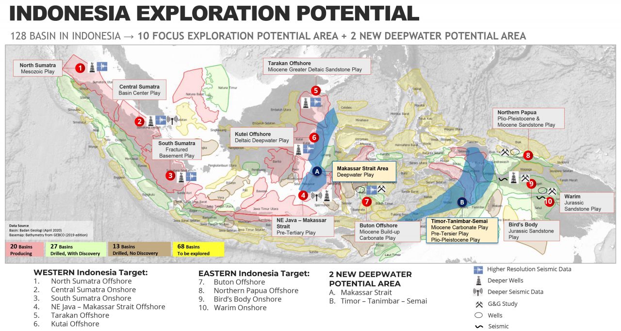 Adapun beberapa fokus area eksplorasi potensial petama adalah di North Sumatra (Mesozoic Play), Central Sumatra (Basin Center Play), South Sumatra (Fractured Basement Play), NE Java-Makassar Strait Offshore (Pre-Tertiary Play), Tarakan Offshore (Miocene Greater Deltaic Sandstone Play).