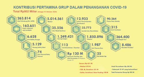 Pertamina memang tidak setengah-setengah dalam membantu pengendalian wabah COVID-19 berdasarkan data perusahaan yang diterima Dunia Energi, hingga pertengahan Oktober perusahaan migas plat merah itu telah gelontorkan Rp902 miliar untuk membantu pengendalian COVID-19. Perseroan sendiri berkontribusi Rp621 miliar diperuntukan untuk medis Rp270 miliar, bantuan dalam bentuk CSR dan donasi Rp251 miliar, sarana dan fasilitas termasuk melakukan sosialisasi, extra fooding Rp100 miliar. Kemudian kontribusu Anak Perusahaan Pertamina total mencapai Rp282 miliar.