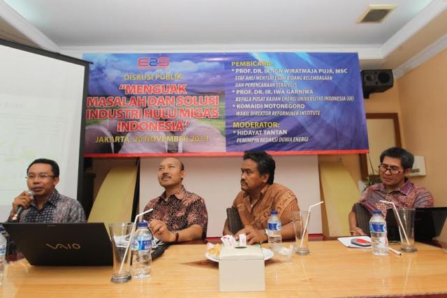 Hal ini terungkap dalam dalam diskusi publik bertajuk “Menguak Masalah dan Solusi Industri Hulu Migas Indonesia” di Jakarta, Rabu, 20 November 2013. Hadir sebagai pembicara dalam diskusi itu, Prof. Dr. Ir. IGN Wiratmaja Puja, MSc, Staf Ahli Menteri Energi dan Sumber Daya Mineral (ESDM) Bidang Kelembagaan dan Perencanaan Strategis, Prof. Dr. Ir. Iwa Garniwa, Kepala Pusat Kajian Energi Universitas Indonesia (UI), dan Wakil Direktur Reforminer Institute, Komaidi Notonegoro, dengan moderator Hidayat Tantan, Pemimpin Redaksi Dunia Energi.