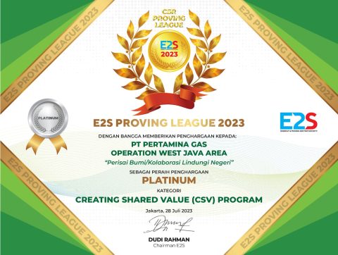 Penghargaan Platinum Kategori Program CSV dari E2S untuk Program Perisai Bumi Pertamina Gas