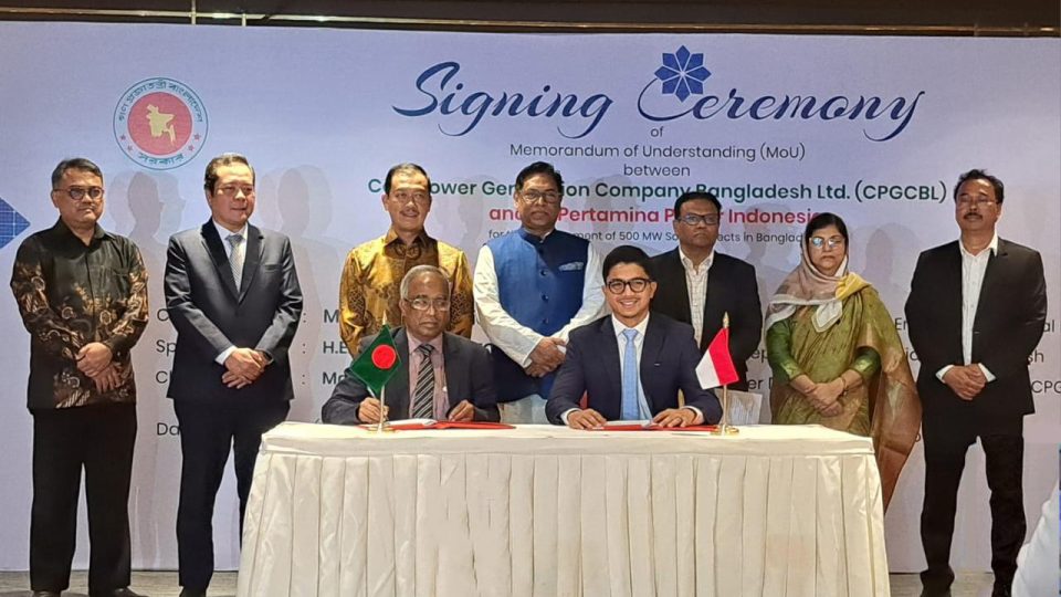 DHAKA – PT Pertamina (Persero) melalui Pertamina New & Renewable Energy (Pertamina NRE) teken Nota Kesepahaman (MoU) bersama Coal Power Generation Company Bangladesh Limited (CPGCBL) untuk proyek pembangkit Listrik tenaga surya (PLTS) dengan kapasitas 500 MW di daerah Moheshkhali dan di berbagai area lain yang potensial di Bangladesh. MoU ini ditandatangani oleh Abul Kalam Azad, Managing Director CPGCBL, dan Fadli Rahman, Pelaksana Tugas CEO Pertamina NRE, di Crystal Ballroom, Hotel Intercontinental, Dhaka, Bangladesh pada Senin (15/7).