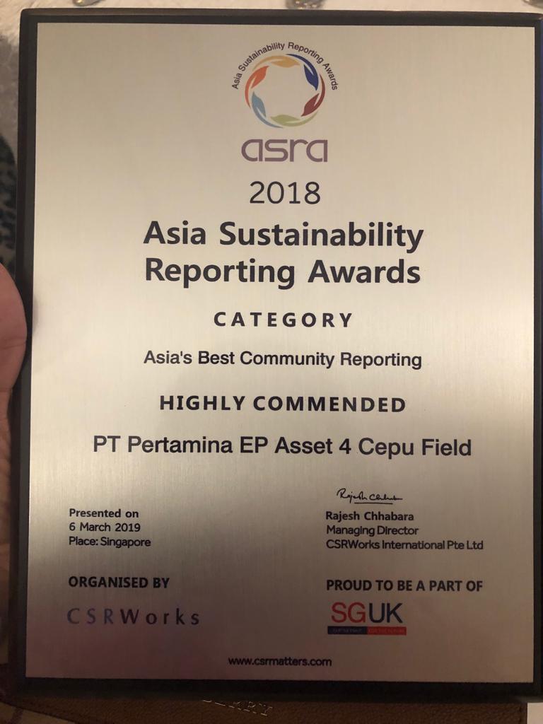 SINGAPURA– Pertamina EP Asset 4 Cepu Field, unit bisnis PT Pertamina EP, mendapat penghargaan “Highly Commended” di kategori Best Community Reporting Asia Sustainability Reporting Awards (ASRA) ke-4 di Singapura.