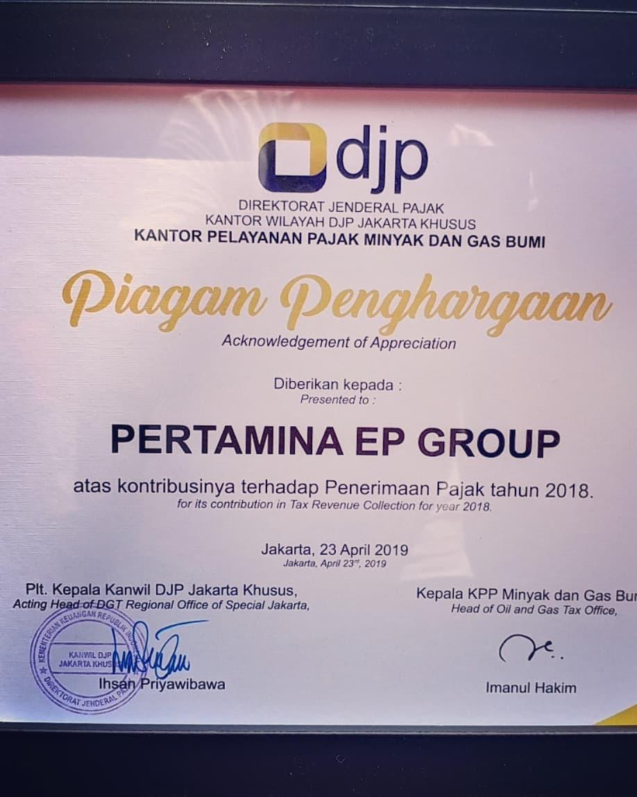 Atas kontribusi Pertamina EP yang cukup besar tersebut, perusahaan mendapatkan penghargaan dari Direktorat Jenderal (Ditjen) Pajak Kementerian Keuangan kepada Grup Pertamina EP sebagai penyumbang pajak minyak dan gas bumi (migas) kedua terbesar tahun 2018.
