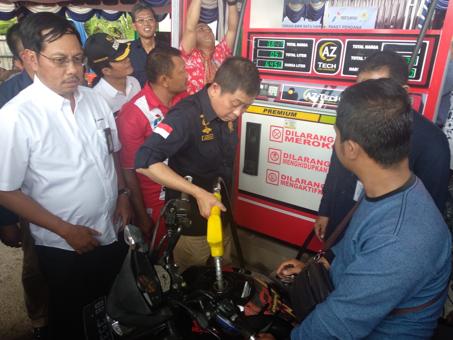 Menteri ESDM Ignasius Jonan mengisi tangki bensin sepeda motor yang menandai beroperasinya SPBU Kompak di Pulau Nias, Sumatera Utara, Kamis (6/12).
