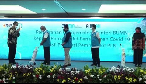 Penyerahan secara simbolis oksigen medis murni dari PLTGU Muara Karang kepada dua RSUD di Jakarta oleh Menteri BUMN Erick Thohir didampingi Dirut PLN Zulkifli Zaini dan Komut PLN Amien Sunaryadi. (foto: dudi rahman)
