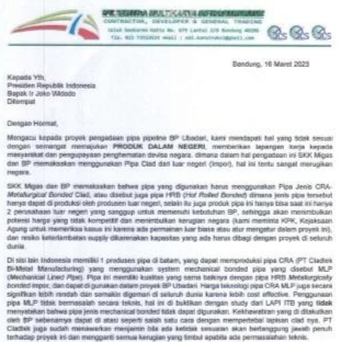 JAKARTA – PT Sentra Multikarya Infrastruktur (SMI) melayangkan surat kepada Presiden Joko Widodo (Jokowi) tentang penggunaan pipa clad dari luar negeri (produk impor) yang diinisiasi Satuan Kerja Khusus Pelaksana Kegiatan Usaha Hulu Minyak dan Gas Bumi (SKK Migas) dan British Petroleum (BP).