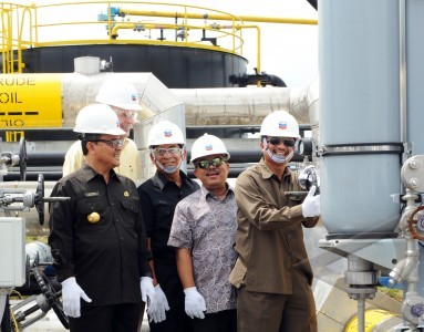 Gubernur Riau Rusli Zainal, Managing Director Chevron IndoAsia Business Unit Jeff Shellebarger, Staf Khusus Menteri ESDM Susilo Siswoutomo, dan Wakil Menteri ESDM Rudi Rubiandini memencet tombol pengiriman resmi minyak dari proyek uji coba injeksi surfaktan ke terminal minyak Dumai.
