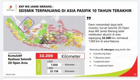 Data Dunia Energi yang dilansir dari SKK Migas menunjukkan, hingga akhir kuartal III 2020, total kumulatif seismik KKP WK Jambi Merang mencapai 32.200, termasuk 1.000 km di area Natuna. Ini terdiri atas 7.050 km pada 2009 dan 25.150 km pada 2020,