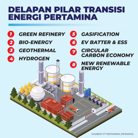 Pertamina pun menerjemahkan penerapan energi hijau yang berkelanjutan ke dalam delapan pilar transisi energi. Pertama, peningkatan kilang yang dikelola perusahaan demi menghasilkan bahan bakar ramah lingkungan. Pertamina menargetkan konstruksi kilang ramah lingkungan dengan kapasitas 60.000-100 ribu ton per tahun bisa terealisasi pada 2025.
