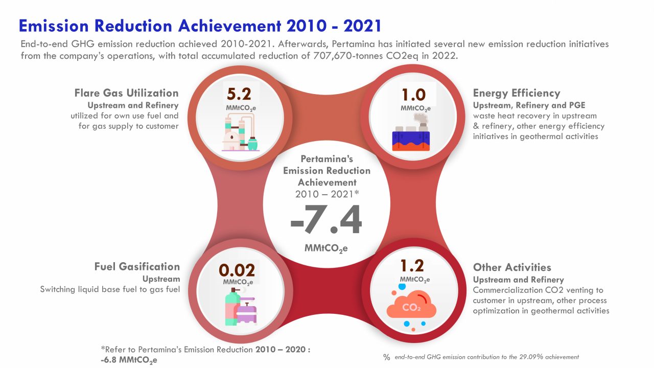 Melalui berbagai inisiatif tersebut, Pertamina menargetkan pengurangan emisi sebesar 30% pada 2030. Proses pencapaian target sudah mulai dirasakan dengan menurunnya emisi sebesar 7.4 Juta Ton CO2 Equivalent (MmtCO2E) selama kurun waktu 2010 – 2021. Hasil tersebut diperoleh dari upaya-upaya efisiensi energi di lini bisnis Hulu dan Pengolahan yang memanfaatkan kembali panas yang dihasilkan dari limbah dan inisiatif lain dari aktivitas Geothermal; pemanfaatan Flare Gas untuk penggunaan sendiri dan suplai gas bagi konsumen di sektor hulu dan pengolahan, gasifikasi bahan bakar serta komersialisasi pelepasan CO2 kepada konsumen sektor hulu dan optimalisasi aktivitas Geothermal.