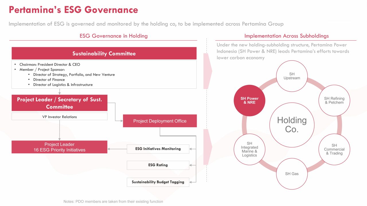 Sementara itu, Satya Widya Yudha, Anggota Komite Dewan Energi Nasional (DEN), menyatakan bahwa ESG sangat penting untuk perusahaan energi salah satunya tentu Pertamina. Apalagi diketahui bahwa Pertamina termasuk Top 5 perusahaan yang fokus dalam penerapan ESG. Dia menyatakan ESG mengadopsi prinsip-prinsip kekinian agar perusahaan menjadi sustainable melalui penerapan pemanfaatan energi bersih, menjamin dampak sosial dan juga penerapan good governance.