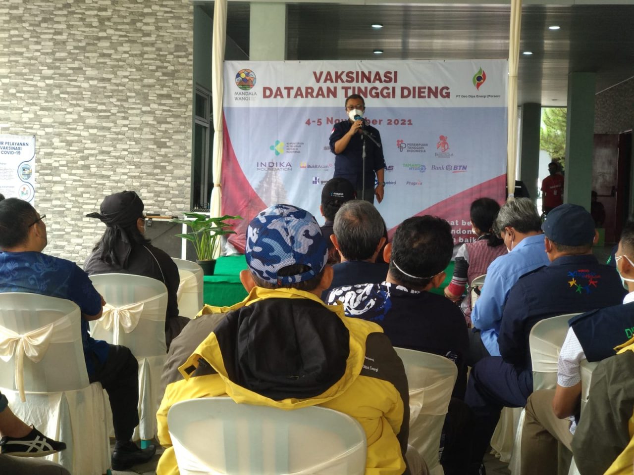Riki F Ibrahm Direktur Utama GeoDipa memberikan pengarakan dalam pelaksanaan vaksinasi COVID-19 di wilayah dataran tinggi Dieng, Wonosobo, Jawa Tengah yang didukung oleh PT GeoDipa Energi. (Foto/Dunia Energi/Rio Indrawan)